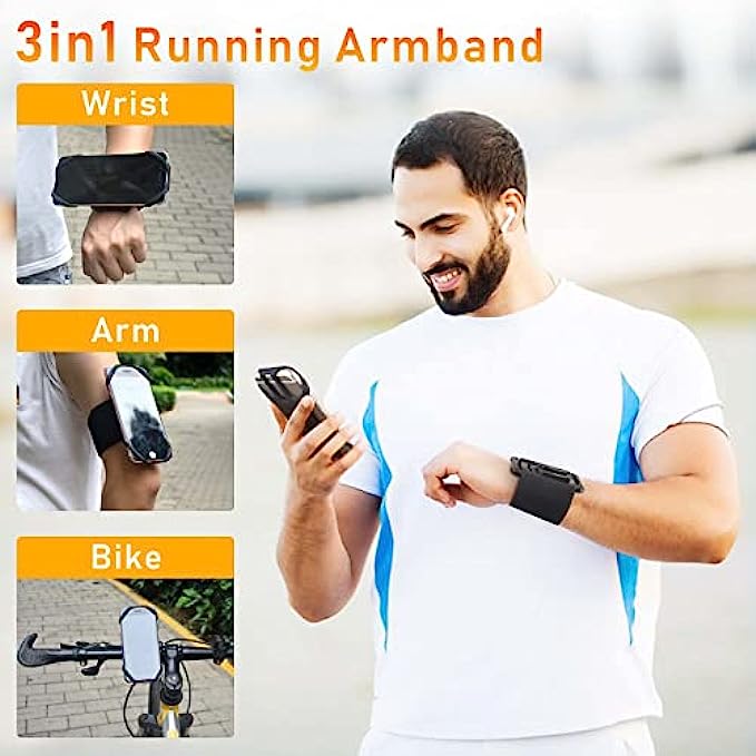 • 3 in 1 running phone wrist strap & bicycle phone mount. The sports armband for men and women has 3 functional applications, you can use it on your arm, wrist and cycling.